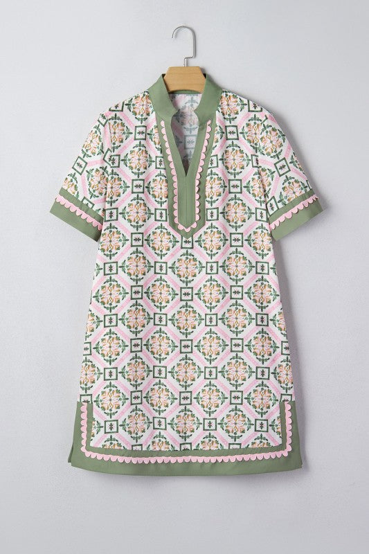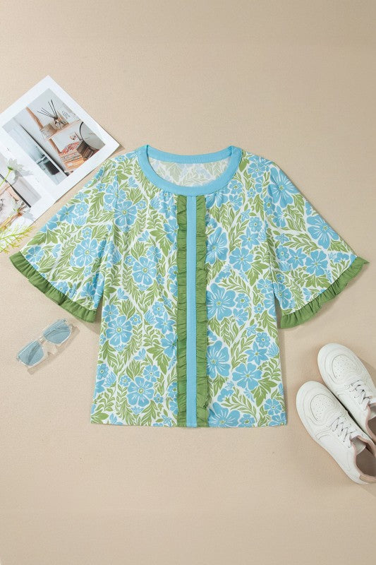 Floral Ruffle Colorblock Trim Short Sleeve Blouse