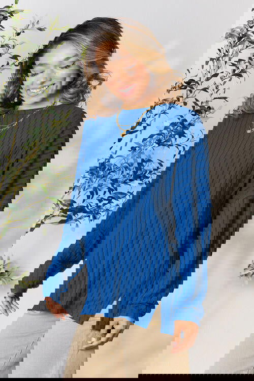 Ribbed Round Neck Slit Knit Top Assorted Colors S-3XL