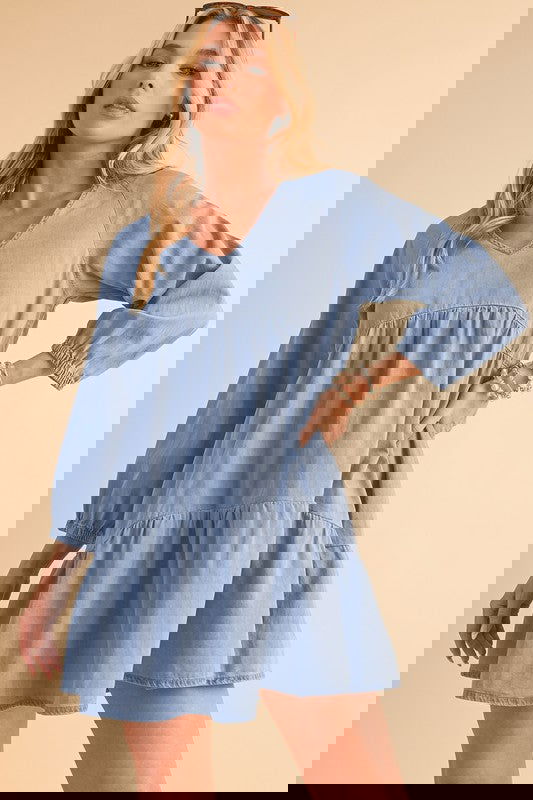 Puff Sleeve Tiered Ruffled Chambray Mini Dress