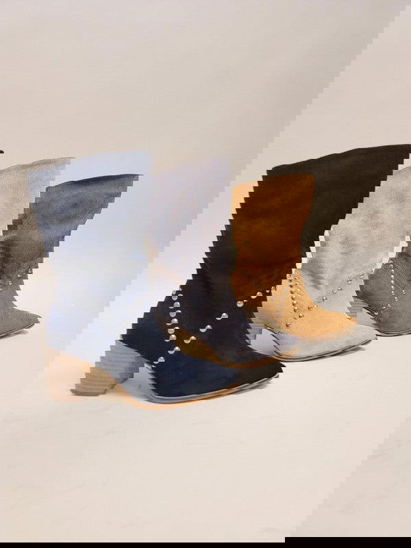 Discover the stylish and edgy MIDI BOOTS, perfect for any casual look. With trendy stud embellishments and a 3" heel, these boots add edgy flair to any outfit. Don't forget to size up half a size for the perfect fit - the model recommends it! All measurements are based on a size 7.5, but may slightly vary depending on size. Made with high-quality artificial leather, these boots are a must-have for any fashion-forward individual.