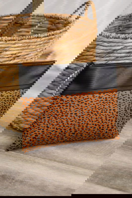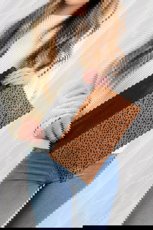 Made with luxurious vegan leather, this clutch features a gold metal ring and full zipper closure. The inside is lined and includes a convenient zipper pocket for added storage. Measuring 13x10.5x2.5, this clutch is sure to make a statement with its stylish design.