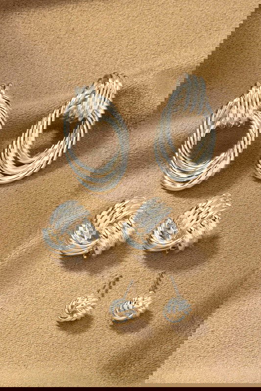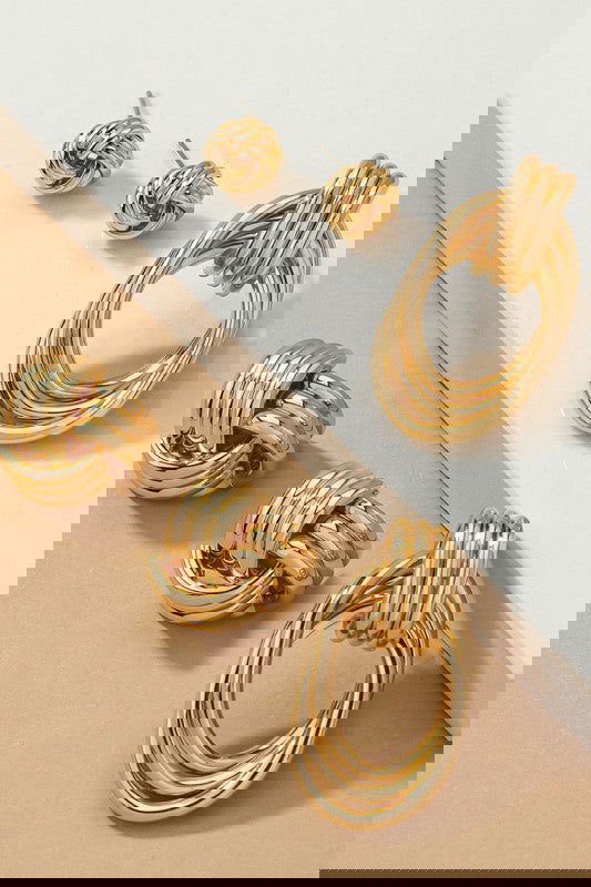 Elevate your earring game with our Premium Trio Metal Knot and Hoop Earrings - a set of three stunning pieces designed to make a statement. Crafted from iron, these earrings feature large metal knots with a very shiny and smooth finish. The shiny gold plating adds a touch of luxury, making them perfect for both casual and formal occasions.